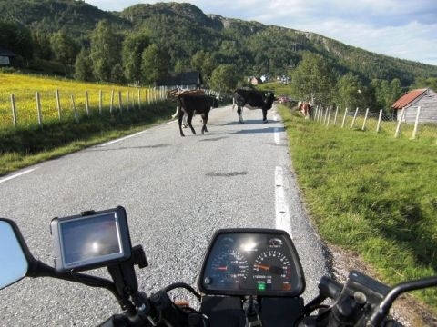 The Bergsdal road takes you up in the mountains on the old road between Bergen and Voss. The area has farms, summer houses and the occasional old power station. Beware of cows, sheep, potholes and blind corners. This is not a good speed run, but a relaxed scenic ride. The scenery is absolutely beautiful, the road is fun to ride and the local bulls are mostly harmless.